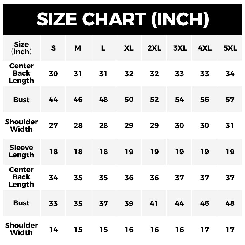 Sizes: S, M, L, XL, 2XL, 3XL, 4XL, 5XL